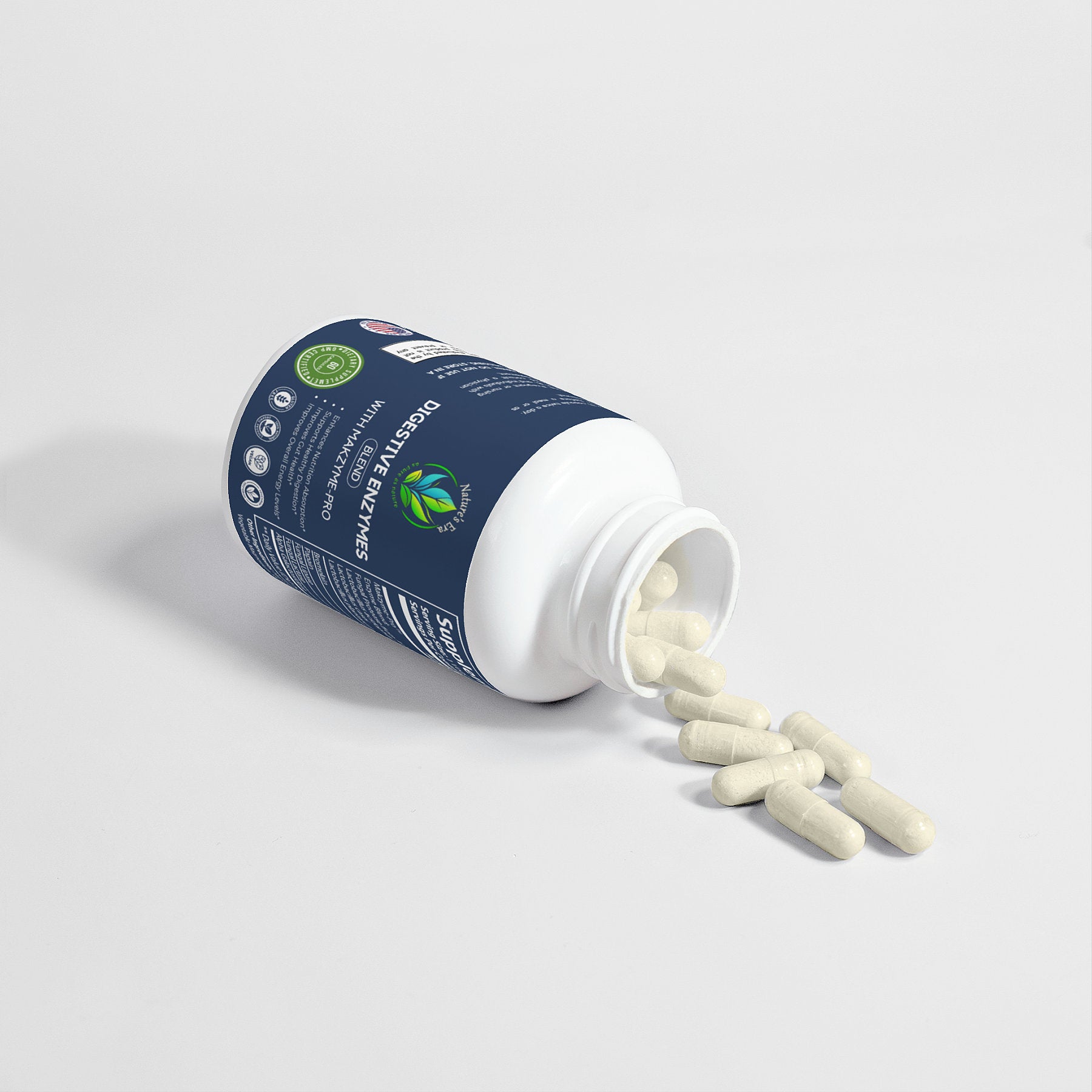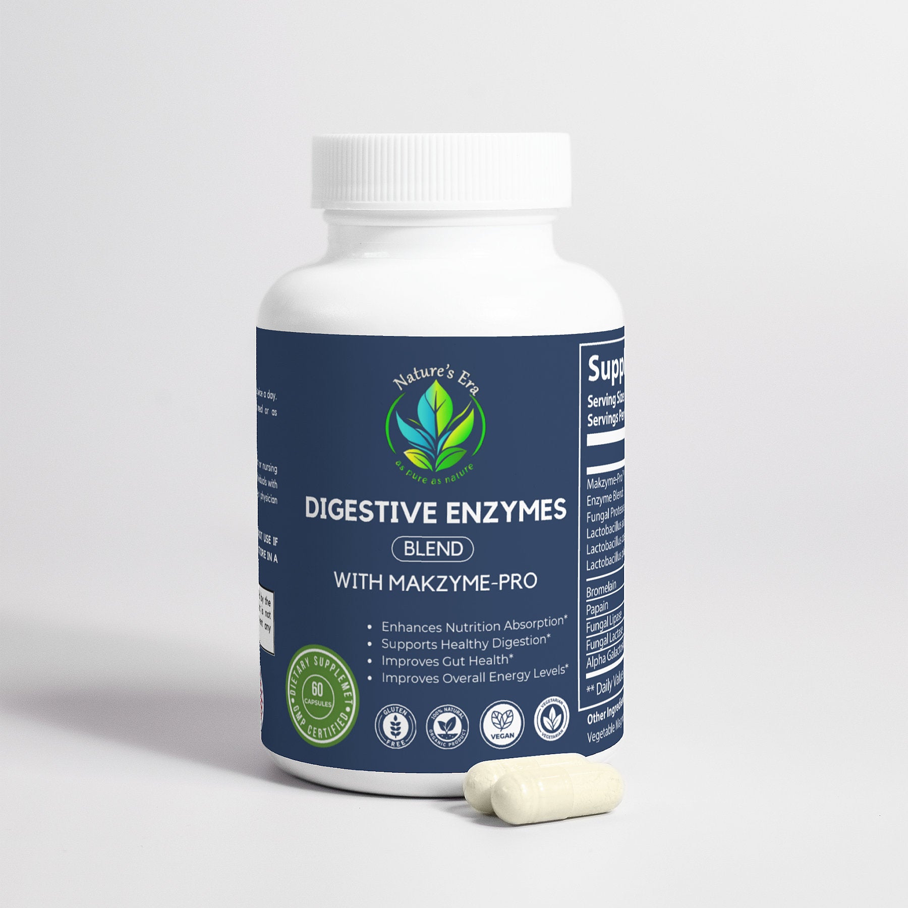 Ingredients: Makzyme-Pro™, Enzyme Blend (Fungal Protease from Aspergillus oryzae, Lactobacillus acidophilus, Lactobacillus cases, Lactobacillus plantarum), Bromelain, Papain, Fungal Lipase, Fungal Lactase, Alpha Galactosidase, Hypromellose (vegetable capsule), vegetable Magnesium Stearate, Silicon Dioxide.