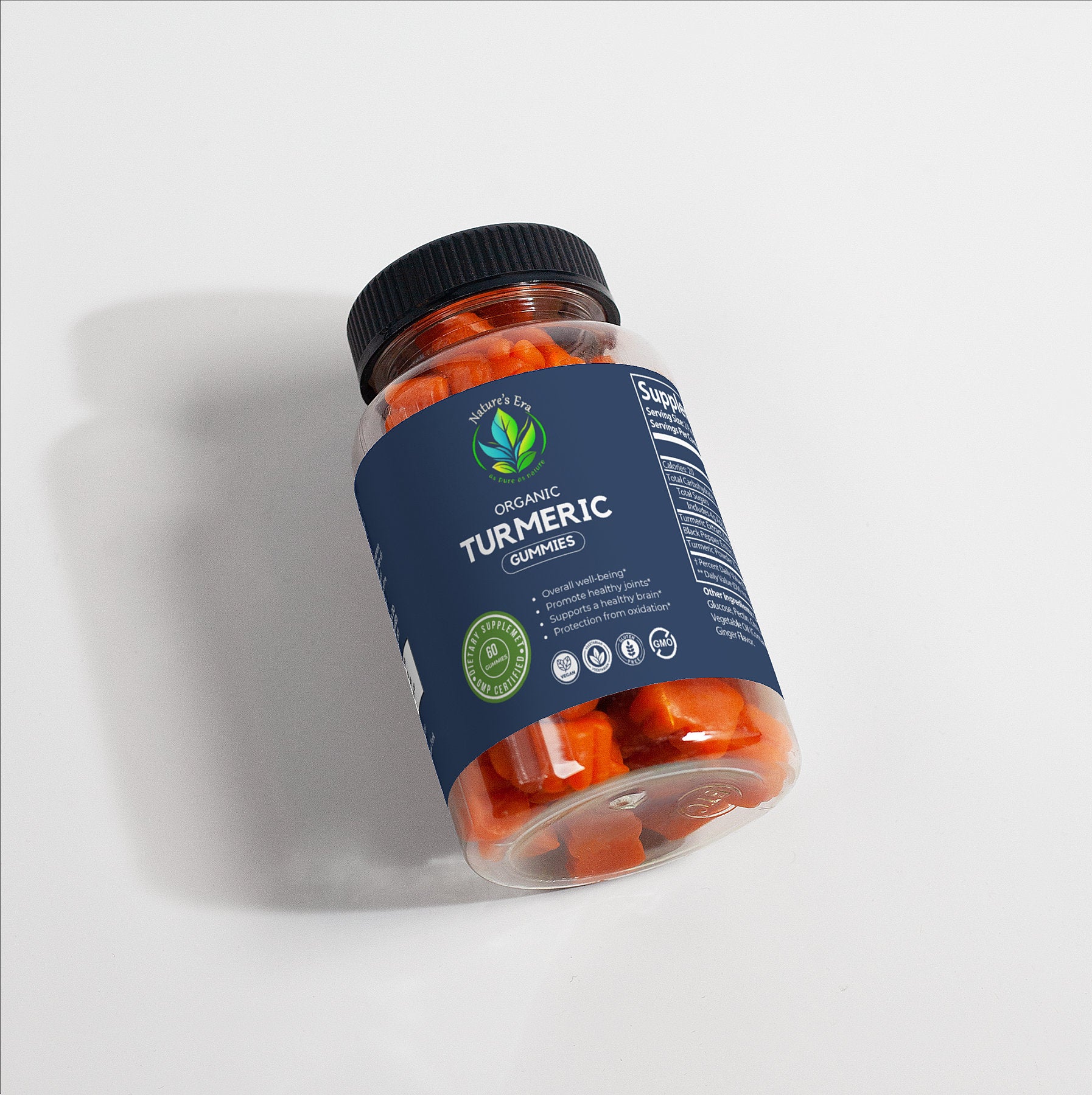 Ingredients: Sodium (as Sodium Citrate), Turmeric Extract (Curcuma longa L.)(root), Black Pepper Extract (Piper nigrum)(fruit), Turmeric Powder (Curcuma longa L.)(root), Glucose Syrup, Sugar, Glucose, Pectin, Citric Acid, Sodium citrate, Vegetable Oil, (contains Carnauba Wax), Ginger Flavor.
